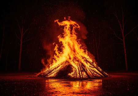 Massive roaring bonfire burning intensely at night, illuminating the dark scene with bright orange and yellow flames. the huge fire reflects dramatically on the wet ground, surrounded by silhouetted bare trees in the deep forest darkness.