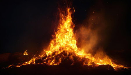 AI Generated. Bright flames dance above glowing embers in a dark setting during a nighttime display of fire