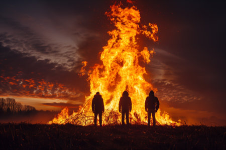 Three Silhouettes Stand Before a Large Bonfire at Night