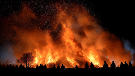 large people crowd only visible as silhouettes in front of a large Easter bonfire at night