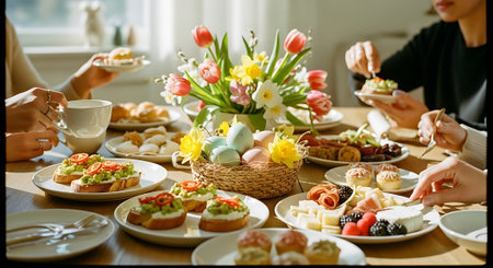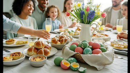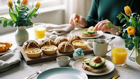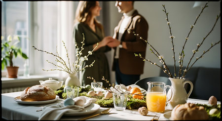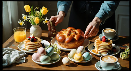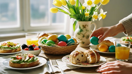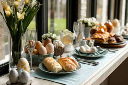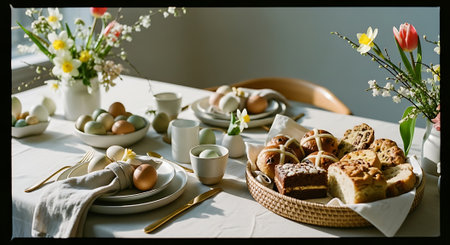 Cozy Easter Breakfast Table with Traditional Pastries, Painted Eggs, and Spring Daffodils. Concept of Easter Celebration, Springtime Festivities, Family Gatherings.