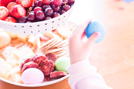 Appetiser tray filled with fresh fruit, cheese and salami for Easter snack.
