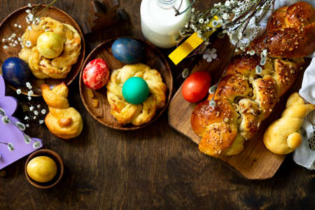 Easter holiday table. Easter cakes and colored eggs on a wooden table. Top view flat lay background. Copy space.