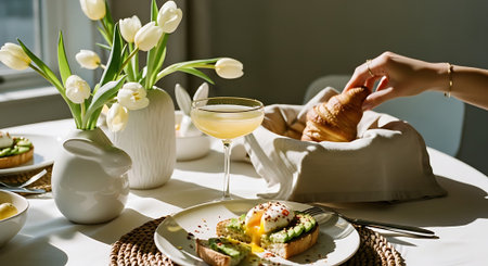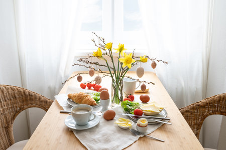 Breakfast for two with daffodils and Easter decoration on a wooden table at the window, copy space, selected focus, narrow depth of field