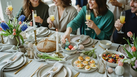 Elegant Easter Table Setting with Smoked Salmon and Decorated Eggs Concept of Spring Celebration Family Gathering Holiday Meal.