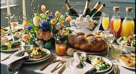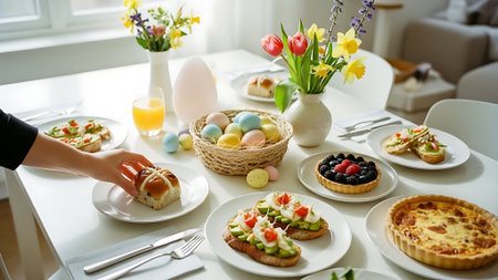 Festive served Easter dinner or brunch table, with Easter egg, tulip flower bouquet, traditional Easter foods - cake, cross buns, wreath bread, glazed ham and spring salad, white table background