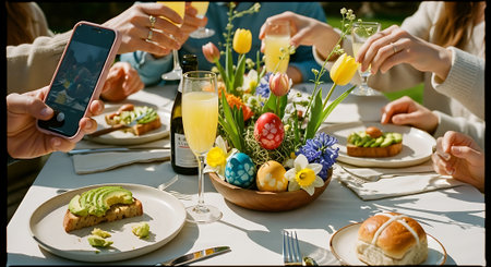 Easter holiday. Photo from your phone, beautifully preserved table, for a festive Easter lunch or Breakfast . The concept of family values and the Easter holiday. top view