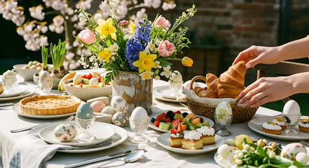 Rustic style Easter table with traditional pastries, decors and flowers