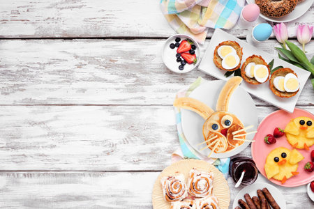 Easter breakfast or brunch side border. Top view on a white wood background. Bunny pancake, egg nests, chick fruit and a collection of spring food items. Copy space.