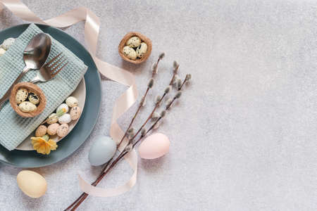Easter table setting ideas, minimal decoration - Easter eggs, willow catkin branches, birds nest on light gray background with copy space