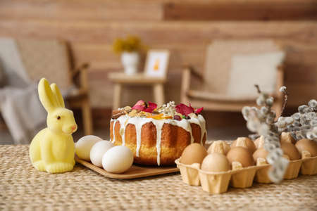 Easter cake, holder with eggs, rabbit and pussy willow branches on table