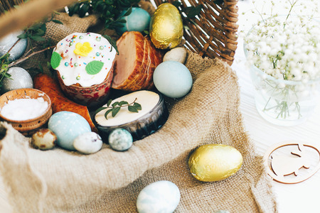 Stylish easter eggs, homemade Easter bread, delicious traditional Easter food in wicker basket and blooming spring flowers on linen napkin on rustic table. Happy Easter! Festive breakfast