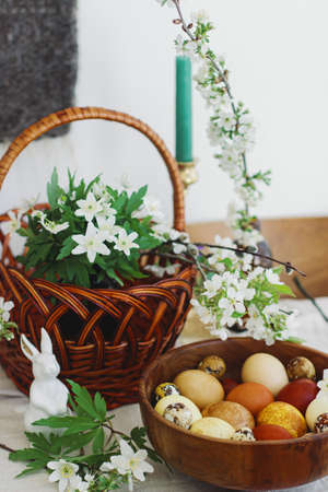Stylish easter eggs in wooden bowl on rustic table with bunny figurines, wicker basket, candle and spring blooming flowers. Happy Easter! Natural dyed eggs in yellow and red colors