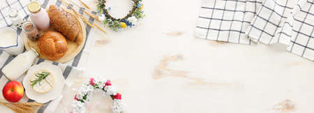 top view photo of dairy products over white wooden background. Symbols of jewish holiday - Shavuot