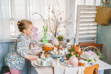 Girl at table with Easter decoration. Celebration in kitchen.Tablescape for home Easter holiday.Family religious traditional festive christianity,catholic food.Colored eggs,cake,fun bunny,candy sweet.
