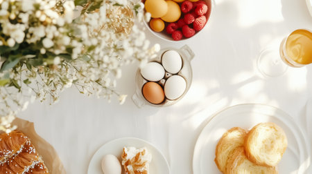 Top view background image of elegant dinner table decorated for Easter in sunlight, copy space