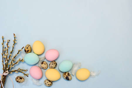 Easter colored eggs in a basket with flowering willow branches on a blue background. Selective Focus