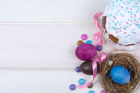 Easter eggs. Happy Day Bright Easter. Orthodox Easter holiday. Traditional food. Creative stylish trend Homemade easter cake. Copy space sheet paper