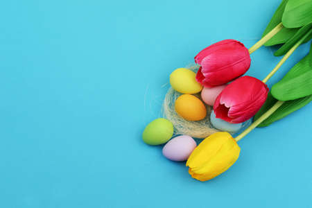 Happy easter time. Bright Easter holiday concept with spring flowers and easter eggs. Colorful Easter eggs background