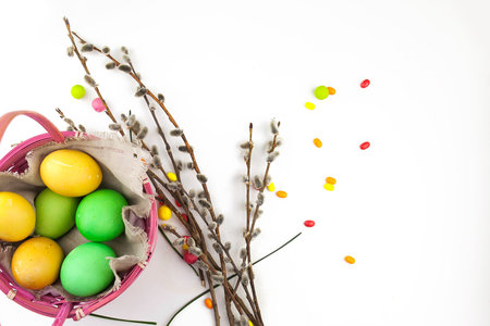 Easter background, colorful easter eggs and decorations next to baskets and pussy willow branches, top view
