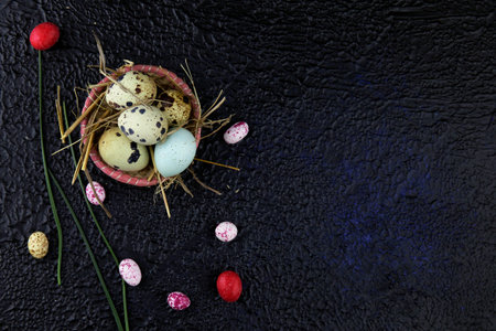 Colorful easter and quail eggs and tulip flowers on stone table. Top view with copy space