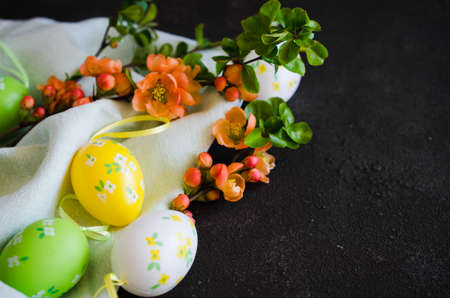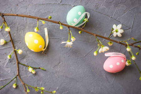 Easter background with decorative Easter eggs and blossoming spring branch on a dark concrete background.
