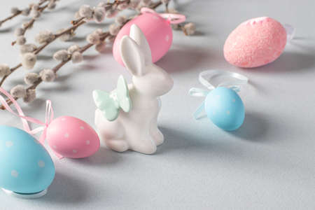 Easter bunny, pussy willow, pink and blue eggs on light pastel background. easter concept