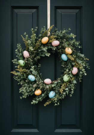 Festive easter egg wreath with greenery on dark door.