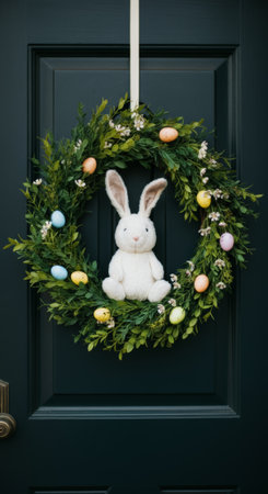 Easter bunny wreath with colorful eggs on dark door.
