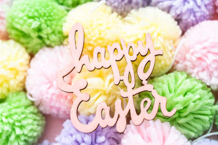Happy Easter sign and pastel color pom poms on a pink background.