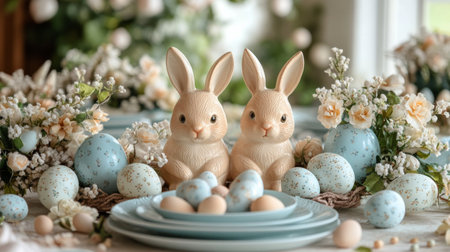 Elegant springtime decor featuring white bunny figures and pastel-colored eggs surrounded by delicate flowers on a beautifully arranged table setting.