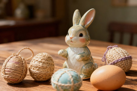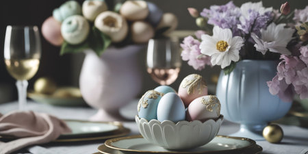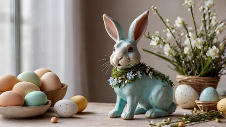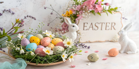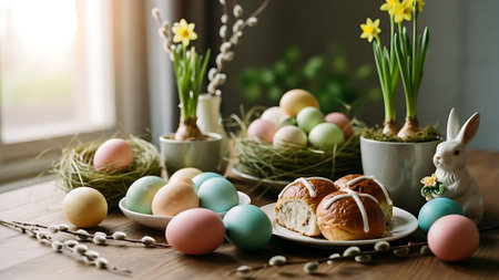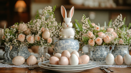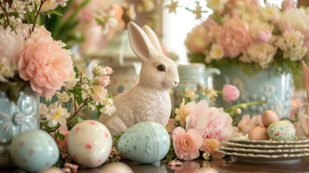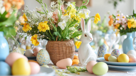 Delicate pastel Easter decorations adorn a table featuring painted eggs, a charming bunny figurine, and vibrant floral arrangements in vases, creating a festive atmosphere.