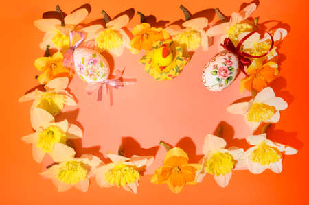 Easter decoration with eggs and spring flowers. Happy Easter card.