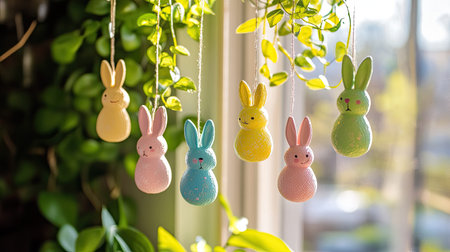 Brightly colored bunny decorations dangle in a sunlit space, surrounded by lush greenery, creating a festive and cheerful spring atmosphere for Easter.