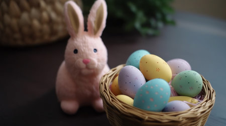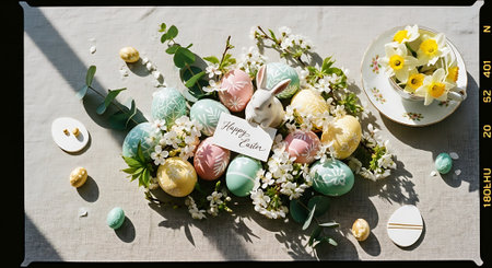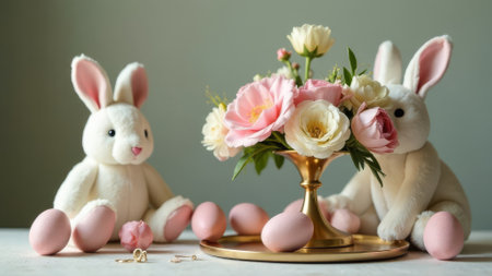 Charming Easter still life with pastel-colored eggs, a plush bunny, and a golden floral frame. Soft pink flowers add a festive, spring atmosphere, creating a warm holiday composition.