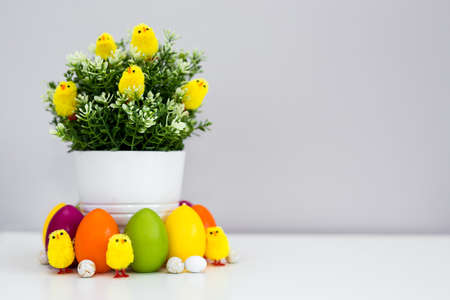 Flower pot with green plant and colorful Easter decorations on the table with copy space