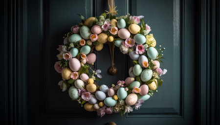 An exquisite image of a Easter wreath, intricately crafted with colorful eggs.