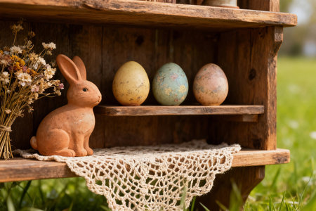 Easter eggs and bunny on wooden shelf in the garden. Rustic style.
