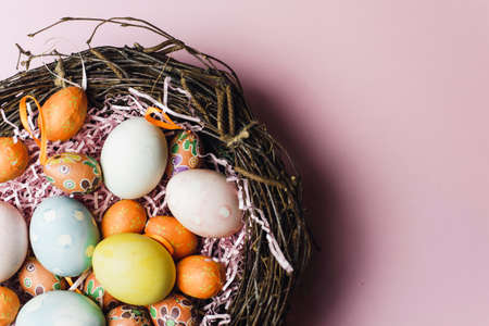 A nest of twigs and hay and a pink paper filler with pastel colored Easter eggs. Painted and decorative eggs for a light Easter holiday. Easter card on a pink background.