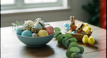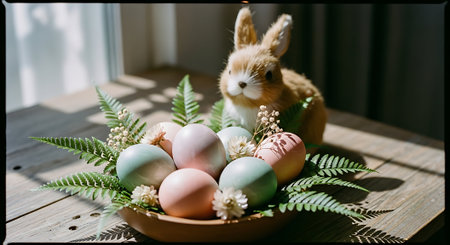 Colorful pastel easter eggs in a ceramic bowl with tulips and ceramic bunny figurines on beige background under natural sunlight.
