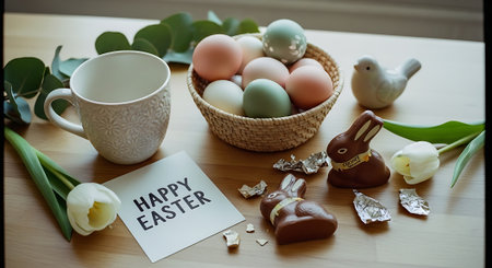 A festive Easter table setting with chocolate bunny and eggs
