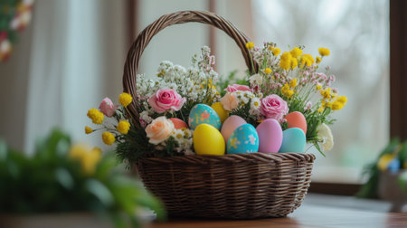 A beautifully arranged Easter basket featuring vibrant flowers and decorative eggs, capturing the essence of spring celebration and joyful gatherings indoors.