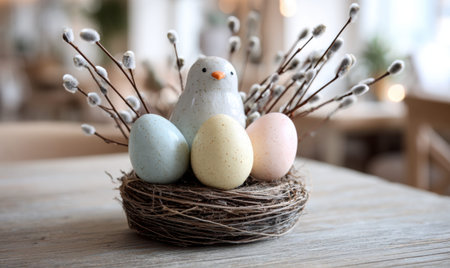 Rustic Easter composition with a decorative nest, pastel eggs, white ceramic bunnies, and fresh flowers on a wooden table. Spring holiday celebration concept