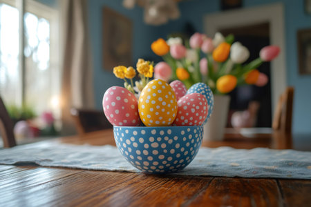 Easter eggs decorated with polka dots sit in a bowl on a wooden table, with tulips in the background, creating a festive scene