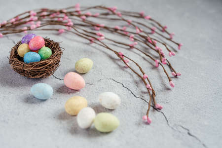 Colourful Easter eggs in birds nest with decorative willow branches on gray cement background