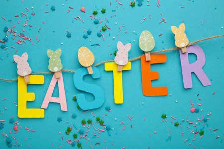 Inscription Easter on blue background, a rope with clothespins. The concept of postcards for the Easter holiday. Top view