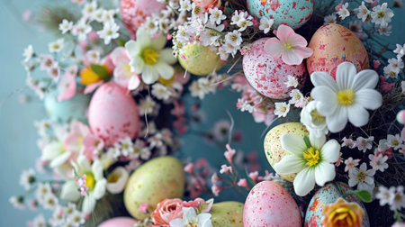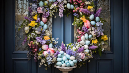 A charming pastel Easter wreath made of delicate flowers and eggs. Perfect for spring celebration.