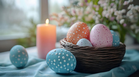 Decorated pastel eggs in a woven nest, near a candle and flowers, creating a serene Easter atmosphere.