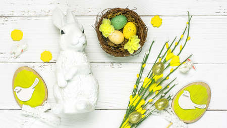 The concept of a bright Easter holiday. Delicate Easter eggs and Easter bunny.