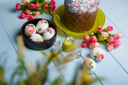 Easter composition with decorated eggs, flowers, burning candle and Easter bread, kulich or cake with frosting and multicolored sugar sprinkles.